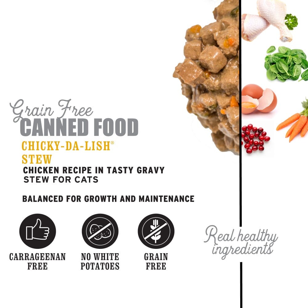 Better break out the can opener, Human. I think your cat is drooling. Made with whole, deboned meat and real fruits + vegetables, our grain free, protein-packed Chicky-Da-Lish Stew will make your cat unconditionally love and adore you. Or, at the very least锟?stop giving you looks of disdain.