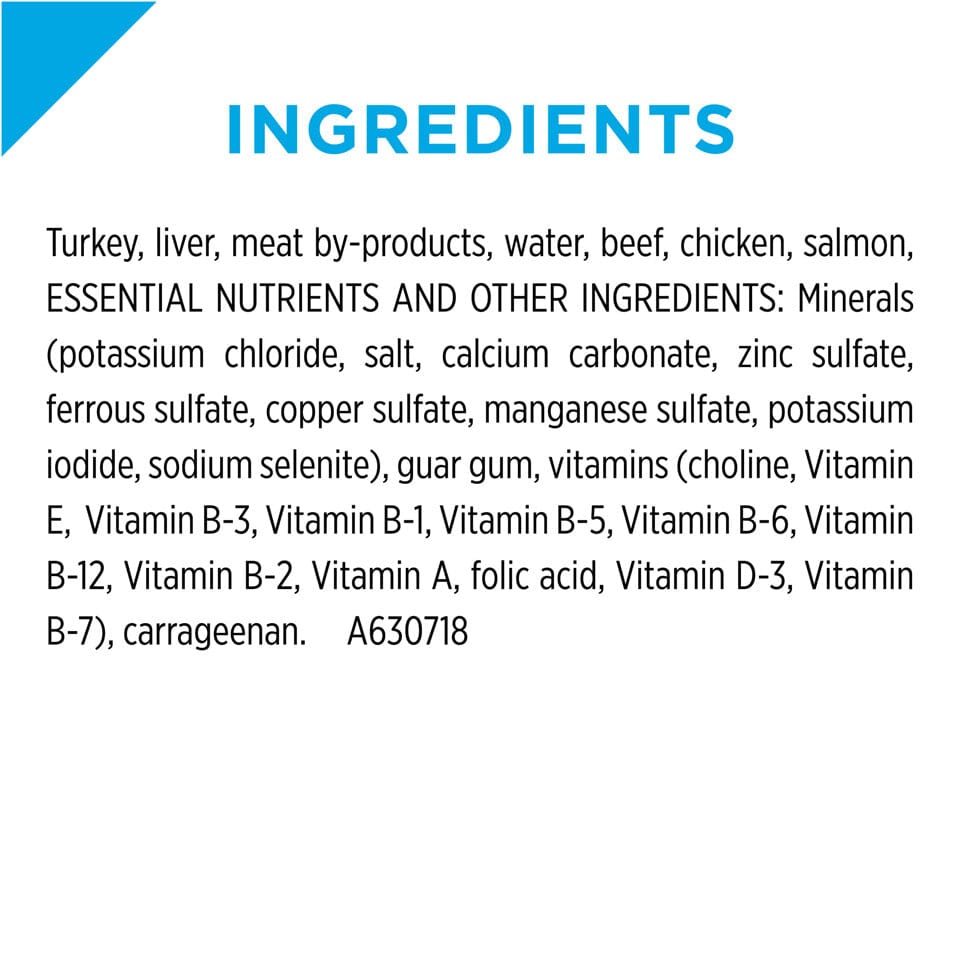 Turkey, liver, meat by-products, water, beef, chicken, salmon, ESSENTIAL NUTRIENTS AND OTHER INGREDIENTS: Minerals (potassium chloride, salt, calcium carbonate, zinc sulfate, ferrous sulfate, copper sulfate, manganese sulfate, potassium iodide, sodium selenite), guar gum, vitamins (choline, Vitamin E, Vitamin B-3, Vitamin B-1, Vitamin B-5, Vitamin B-6, Vitamin B-12, Vitamin B-2, Vitamin A, folic acid, Vitamin D-3, Vitamin B-7), carrageenan. A630718Guaranteed Analysis